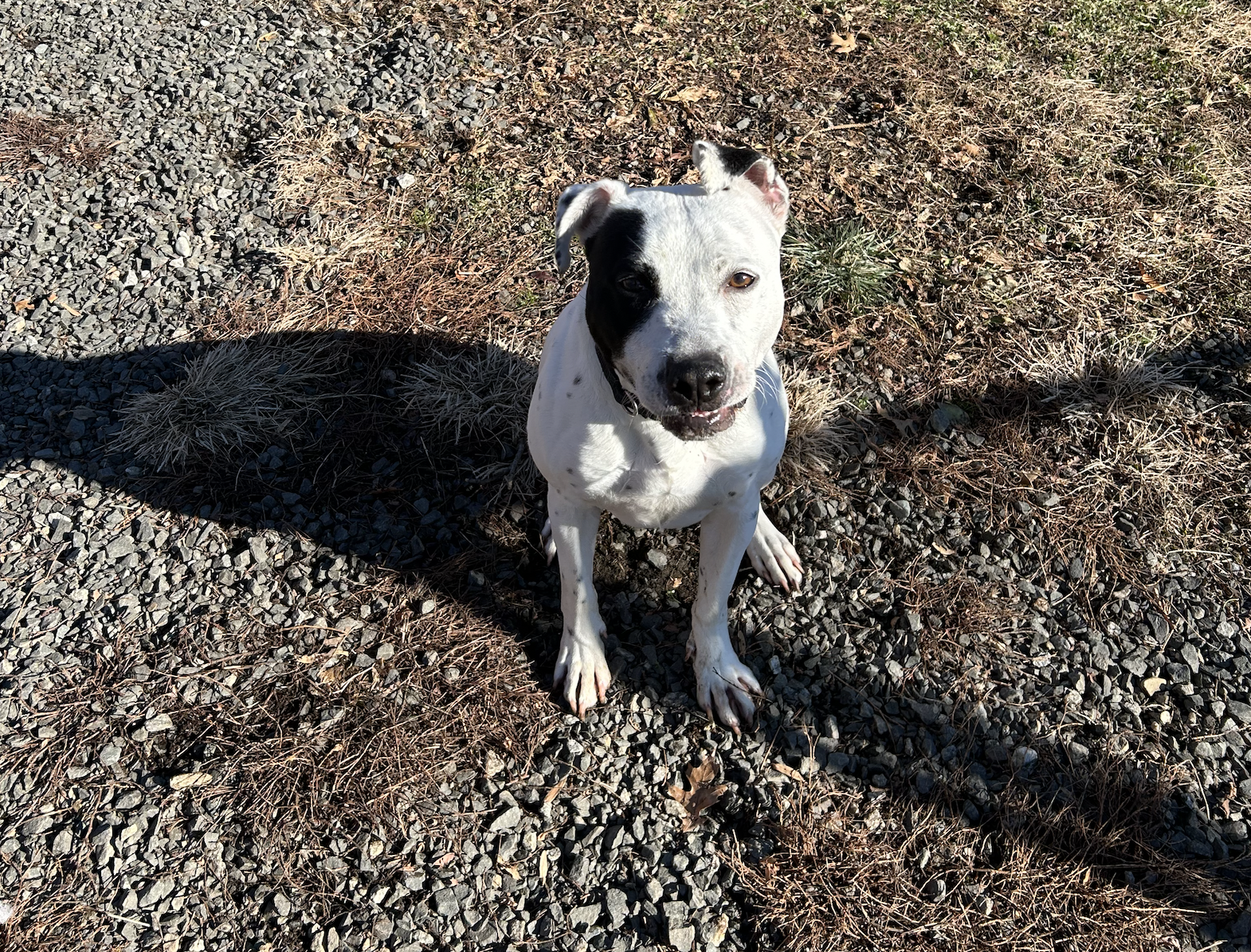 Tell Denali to wait, sit–and he will quickly obey. Throw the Jolly Ball egg and there he goes… he quickly figured out how to grip it (a bit frustrating a first, listen to his vocalization in the video, but he got it in just a minute)– and return with that tail going like a windshield wiper at full speed. Again? Yes, please. Should have taken more video, but was totally engaged in play throw-fetch-get-it with this good boy. Oooh, he is smart, smart, smart. He understands and respects a pack leader–drew me like a magnet. But then recalled am here to learn, listen, write about these pups to find them their people.